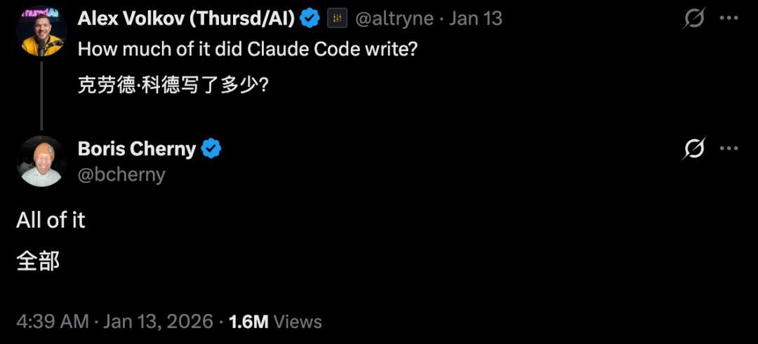 这种现象无论是在行业内外,都变得流行起来。早在年初 Claude Cowork 的发布,Claude Code 相关负责人,就在 X 回复网友,所有的代码都是由 AI 辅助完成。