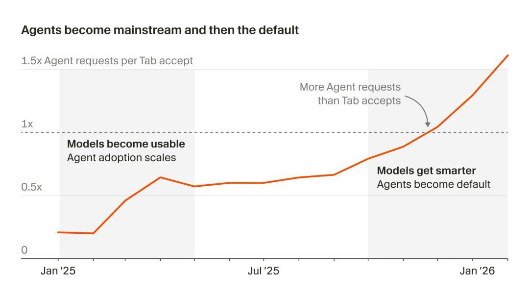 35% 的 PR 已由云端 Agent 创建,Agent 用户数量已经是 Tab 用户的 2 倍