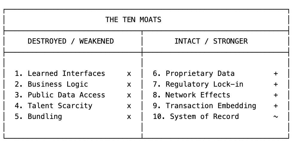 Fintool 创始人 Nicolas Bustamante 在上个月的 X 长文中提到软件的十大护城河,其中需要学习的界面、工作流、公开数据访问、人才需求性和销售捆绑这五个过去软件的护城河已经被削弱甚至摧毁了。而私有数据、合规管理、网络效应、交易嵌入和记录系统地位这几点,则会巩固地更深。