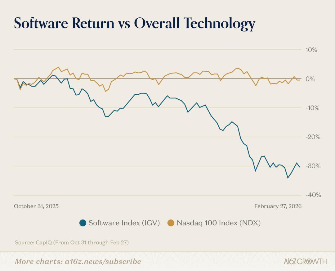 今年年初以来,一批我们耳熟能详的大型软件公司股价跌了将近 30%,有人把这波下跌叫做「SaaSpocalypse」——软件行业的末日。逻辑听起来很简单,AI 让写代码变得极其便宜,人人都能一句话做一个应用,软件公司还值什么钱?
