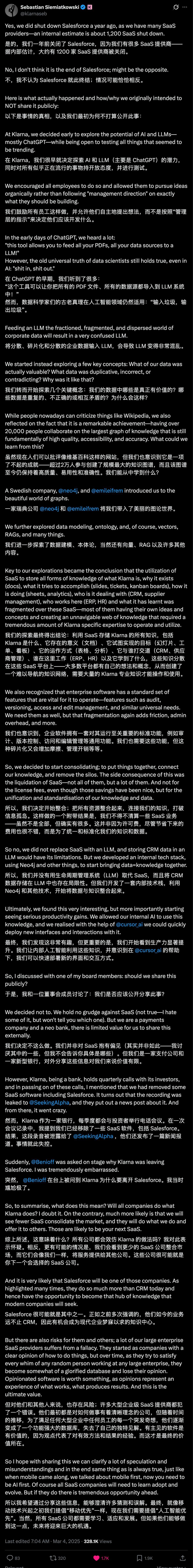2024 年,有一家金融科技初创公司 Klarna 的创始人兼 CEO,在 ChatGPT 出来之后选择放弃使用 Salesforce 的旗舰 CRM 产品,转向自己开发的 AI 系统。一年后,他在 X 发文说,他不认为其他人会,或者应该效仿他的做法。「我不认为这是 Salesforce 的末日;或许恰恰相反。」